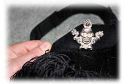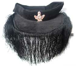 The domra is a unique type of head or facial ornament, brought to Tibet by the great master of Shijé, Padampa Sangye. The origin of its name remains vague, and no informant has yet been able to verify the roots of the term. The tomra consists of a short visor, not unlike one a poker player or sunbather might wear, jutting out 4 to 6 inches from the forehead. It is made of black felt with a black or red underside, from which are vertical black ropes or strings hang freely. About 6 inches in length, these are traditionally made of yak hair, though nowadays cotton, silk or polycotton strings are more likely. This arrangement allows the practitioner to see clearly through this screen, but his/her eyes are obstructed to the outside viewer.
