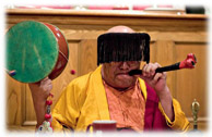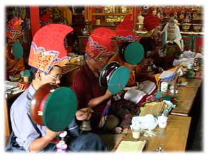 The purpose of this unusual apparatus is simple: to shield the timid and frightened spirits from the brilliance of the practitioners powerful gaze. The energy streaming from the eyes of an individual who has some Chod experience or realization can indeed be overwhelming and overpowering for lower spirits, even though they are themselves noxious and frightening harm-doers. It is thus out of compassion that one wears the domra, to allow all lower guests to partake of the red feast.